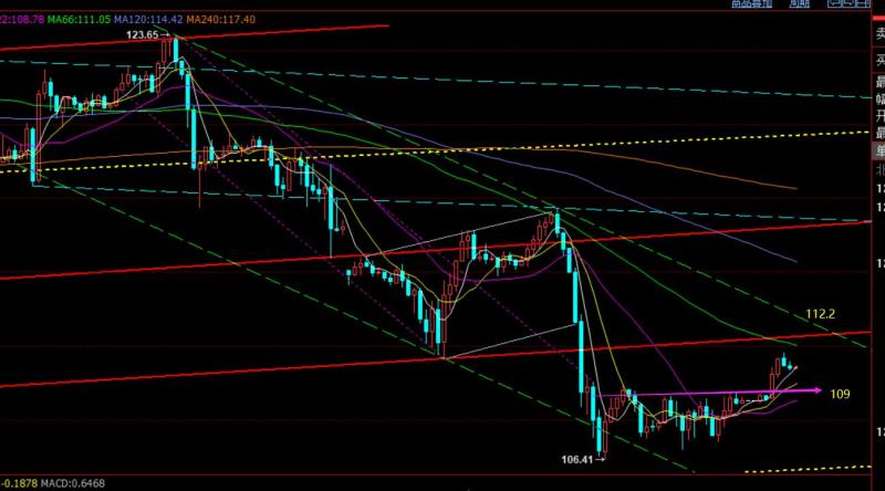 操作上:回踩109逢低先多,首次触及112.2下压制短空,目前来讲,区间也暂时不大,关注支撑和阻力之间的有效破位得失来扩大运行范围;有一点需注意,若先下后上,则109可以尝试多;若先未到支撑,先去试探阻力再下去,109就最好要观察下了,毕竟日线短趋势还是处于震荡压制,通道下轨支撑106-105.8昨日也并未试探;