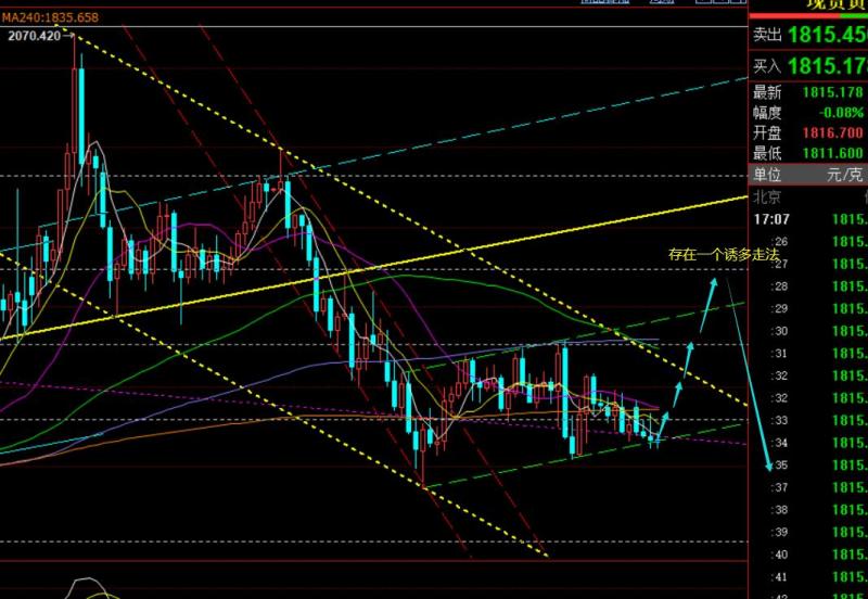 第一,黄金日线级别:昨日又是收报一根长上影阴K线,这几日短期看起来是震荡弱势,但可以发觉它也打压不下去了,多次冲高砸下去都无法有效破底,容易再探底拉升反攻;当弱势的时候,多次发力无法砸下去,意味着容易走物极必反的上攻;另外,1786-1805前期两低点形成的趋势线支撑也有效撑住,极有可能依托此线给黄金带来一波拉升,去冲破中轨扩大反弹力度,甚至循环2075那一波,产生一个小单边上行,刺破2070压制以来的下降通道上轨阻力位,来一下诱多局面,之后再7月份末前炒作本年第四次加息而打压金价回来;
