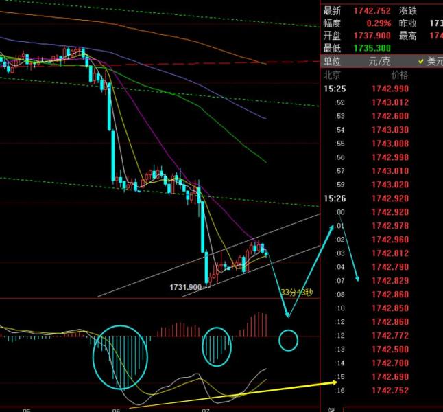 第三,黄金小时线级别:隔夜大幅下挫,凌晨低位小幅反弹承压1744一线,今日早盘先反弹冲击1747.5有所压制,此位置属于隔夜跌幅反抽382分割压制点,下方关注1738-39,属于小幅反弹形成的小型通道下轨支撑,一旦大阴破位,则容易极弱续跌;关注欧盘走势强弱,只要它处于横盘不上或者先下挫连跌,美盘都应二次看弱势延续;另外,macd已经形成一重背驰酝酿,一旦价格失守1732走跌延续,则会形成二重背驰;那么,一般来讲,二重背驰会展开一定超跌反弹修正,因此参考日线下一个支撑1720,建议此位置上下要留意支撑效果,考虑是否反手短多试探,去测试超跌反弹;当然,反弹一波后还会震荡压制下来,不过由于跌幅过大,一旦修正,力度也至少会有三四十美金;