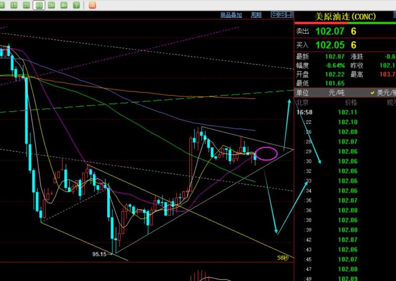 今日而言,日线收阳力度也大,但前期大跌破位通道下滑,判断今日为区间震荡内运行为主;可以关注两个极端点,一个是106.6一线,属于114跌至95.1反抽618分割阻力点;一个是98.8一线,属于昨日涨幅回调618分割支撑点;较为保守的可以踩这两个点去布局多空震荡单子;从走势循环来看,隔夜拉升,今日欧盘若无法突破站上隔夜高点走持续拉升,则晚间容易先下探一波再拉升,当前它在一个缩口三角内走整理,103.3-101.3之间;