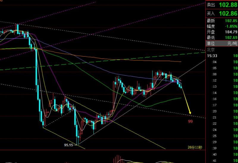 4小时此时有所破位10均线,小时线失守短期趋势线支撑,且呈现连阴格局,暗示价格存在进一步的下滑,隔夜105.2一线也是提出的逢高做空位置,因为它是处于111.4-95.2反抽618分割位置,对于一波大幅拉升或下跌后,首次给到618都应尝试,极有可能是一个短期拐点;当前压力下移至103.8下,此位置下继续逢高空对待,支撑看102-101.5,破位则先指向99,这个位置是105.2-95.2回踩618支撑,波段角度而言,有概率指向95.2和93;