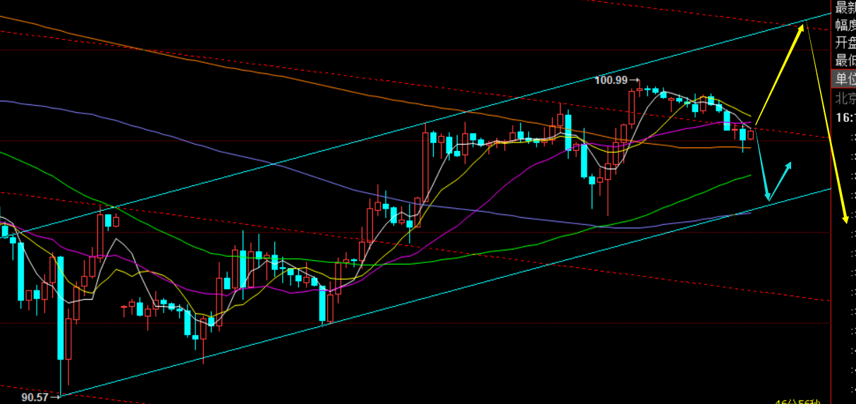 原油操作思路上: 103上下是计划波段空,短线98.2、97两支撑关注企稳多; 若提前失守97大幅下挫,则提前见顶;