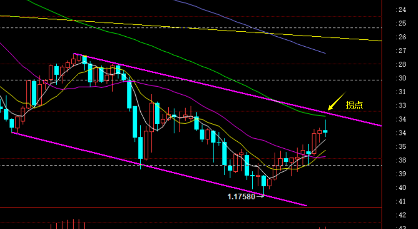 上图是英镑日线级别: 也是下降通道,只是即将测试上轨1.228处,触及可参与空试探承压如何;站上了,则会一定程度上展开进一步的反弹上攻;站不稳,则继续通道内压制为主;