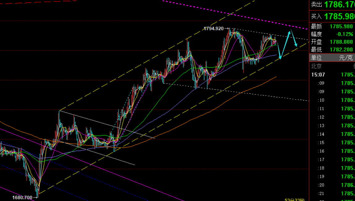 第三,黄金小时线级别:隔夜持续慢涨,凌晨收盘于高位不回测,今日早盘按照循环则直接布局做空,因为多空延续性这几日较差,一般10点前后还无法上冲,则容易压制慢回踩;当出现顶部大阴K,且有效失守短期10均线后,隔夜的逼空走法也就结束了,日内会展开一定下探修正,只不过当前力度并不大;欧盘关注1791早盘开跌口,若要压制下去,这里是不好再去上破;下方关注1779和1775-74,前者属于618分割支撑点和顶底转换点,后者属于短期上行通道下轨支撑点;重要的支撑防守应该是1770-1765,这里预计不好下破,还会企稳进行反复上攻,要等到明日才能做最后的胜负;若参考五六月份走势循环,是倾向于盘整之后下破,指向1740及下方,打开更大运行空间;