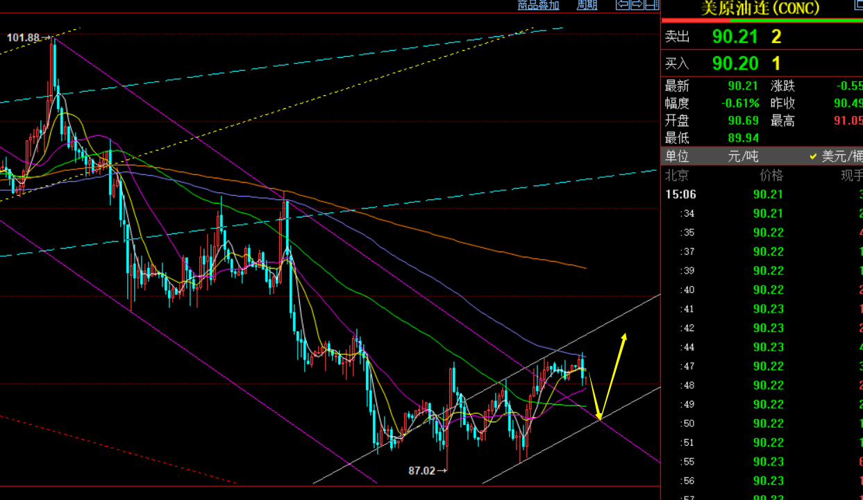 原油方面:昨日晚间持续走高,符合日内看反弹修正思路,日线收阳,短期要关注年均线和10均线两个压力点,即91.9和92.9;同时,由于当前还处于反复震荡期,不好直接横盘去追涨,可等待隔夜涨幅回测618分割支撑88.65上多,也基本是短期通道上破后的回踩确认点;