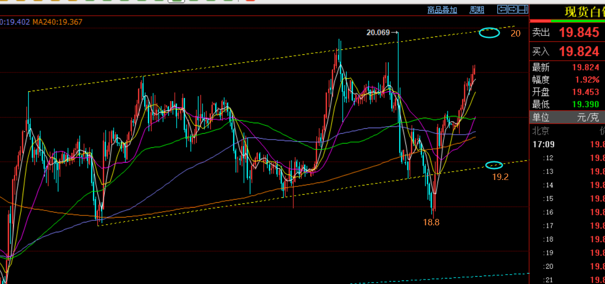 白银方面:它的反复震荡性更加厉害,昨日欧盘的连跌,原本有效失守小时线年均线,且破位箱体震荡支撑,但美盘依然V回去,打回箱体通道内,又穿上年均线上方;之前我们参照小时线年均线还是比较灵敏有效,不管是上破还是下破,都会持续跌个几天,但现在一天之内上下反复串,就失去了它原本的价值参考;因此,现在白银只能重点关注20一线的重要承压防守,支撑18.8,在此区间内宽幅震荡对待;