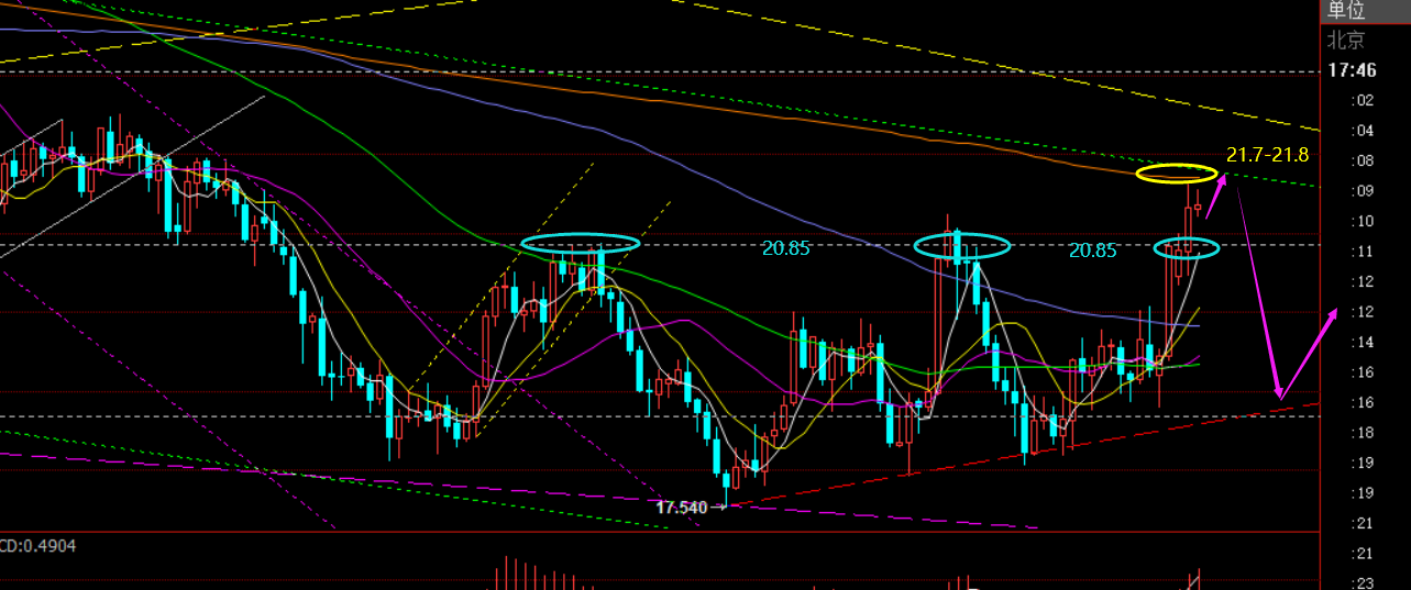 第二,白银方面:昨日也是直接站上了20.85阻力位置,冲击21.6一线高度;