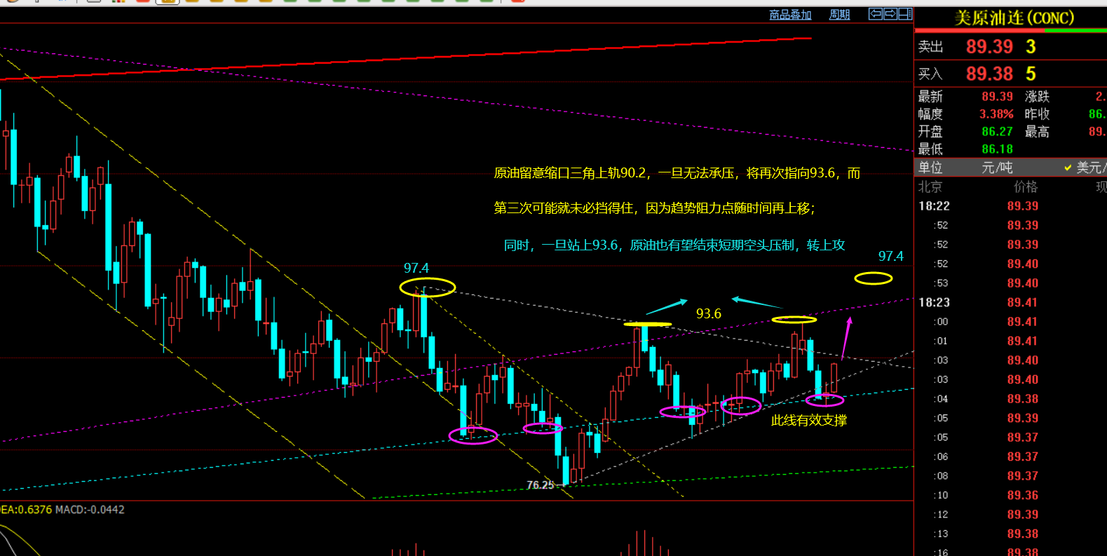 今日早盘简单说来,盯住87.3隔夜高点得失,一旦突破,就是短期通道被打破,93.6压制下来的弱势持续跌也就结束了,那么当87.3强攻突破时,不就是入多机会吗? 而这轮拉升,关键阻力是90.2,这里若挡不住,可再度试探93.6,而第三次试探,挡住的几率有多大呢? 再看图中,除了93.6外,也只有97.4了,它若突破,你敢想象力度吗? 走一步看一步,不断推动盈利损保护;只要87一线守住不破,这波震荡拉升还会延续;而原油的波动率以及一根筋特性,大家都知道,不要小觑,也特别受消息面刺激,务必做好风控!