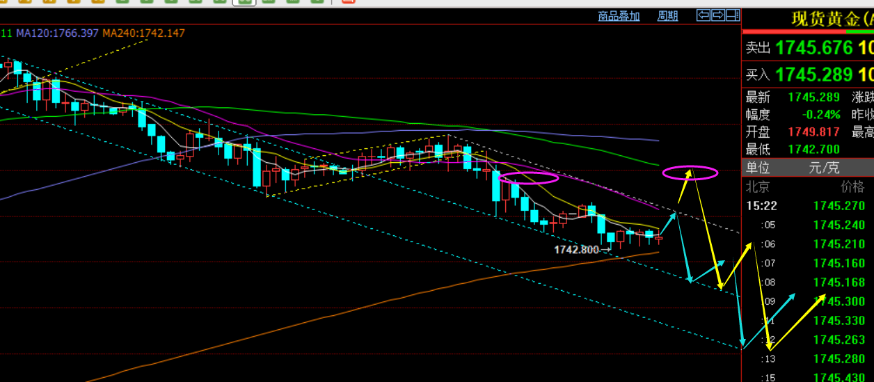 第一,黄金方面:上周五亚欧盘依托短期上行慢通道震荡反弹,最终美盘压制1771不过,承压通道上轨1767下迎来一波破位跳水走跌,当价格有效失守1760-61下轨支撑后,就基本认为打开下滑空间,最终1746短期目标也全部到位收割;