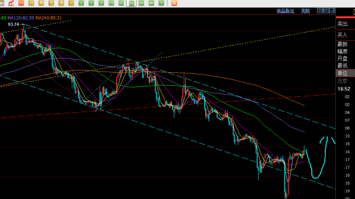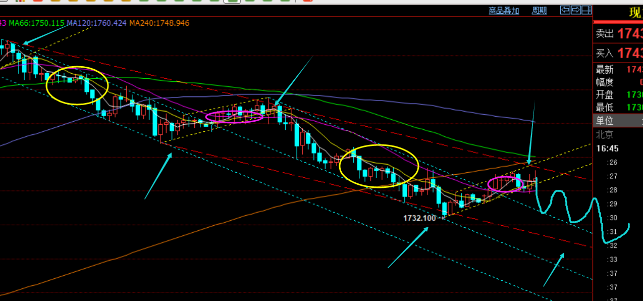 第三,黄金小时线级别:今日早盘震荡直接反弹,这个节奏似乎开始重演上周五白盘的走法;当一波下行通道上轨被突破后,转为一定窄幅上行慢通道修正,然后失守上行通道下轨支撑,则又步入新一轮的震荡下行通道;因此,当前下轨支撑是1742一线,一旦有效大阴破位失守,则会延续下滑,去回踩确认上一个下行通道的上轨位置,同时一旦经过多次回踩确认,则会形成新的下行通道;另外,若回踩确认上轨位置未支撑住,那么会深度加大下跌空间;同时,把这几天的上行通道、下行通道全部包含在内,可形成一个全新的下降大通道,也即是通中通的走法;