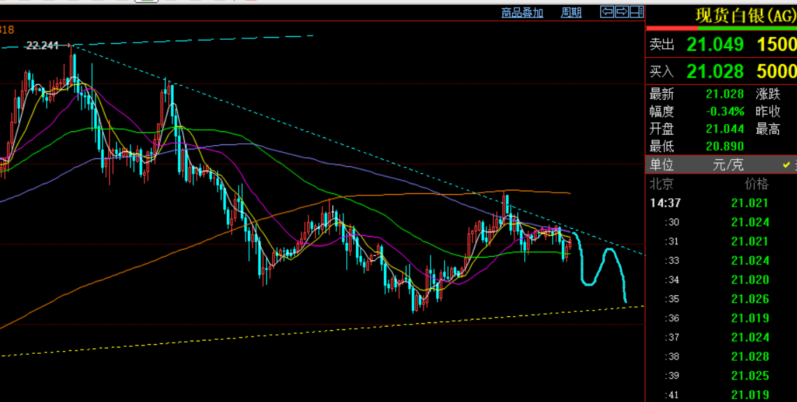 第二,白银方面:21.3阻力下也如期下滑,虽空间不大,但思路吻合;