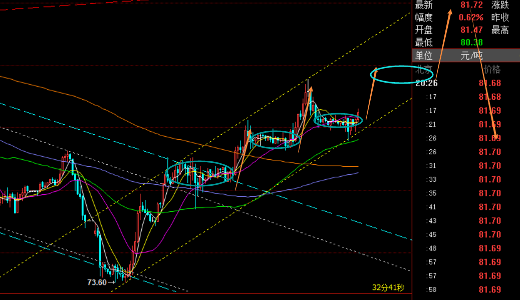 原油方面:循环推演模式还在,上行通道还在,日内这几天都是箱体小洗盘横盘,晚间就是一根筋拉升破高;关注81一线支撑,守住继续震荡看涨,阻力82.5、83.3、85三处;