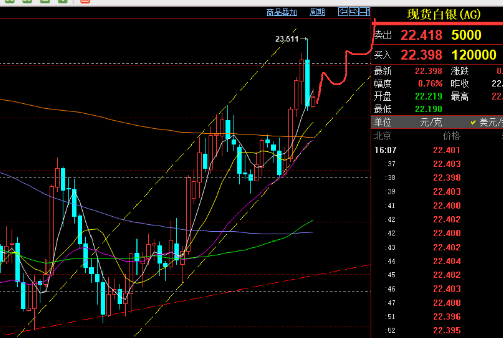 第二,白银方面:同样的,欧美盘大幅的掉头向下,破掉了上行通道关键支撑22.77一线;