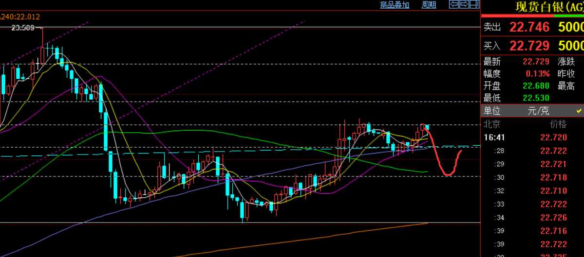 第二,白银方面:同样的,早盘以22.1上作为日线支撑点,也是直接先看涨一波,晚间最终 突破22.58压力,冲击试探了22.75一线压力;