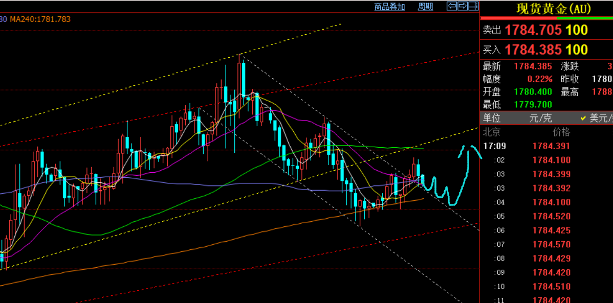 第一,黄金日线级别:昨日收阴回测,在四连阳形态后并未延续上攻,那么继续维持区间内多空整理,当前10均线支撑还未有效失守,年均线阻力同样承压,价格卡在1780-1800区间内运行,上下都没有很好的延续性,得借助消息刺激才能打破此僵局,今晚CPI通胀数据或是一个导火索,看上下的有效得失情况;整体来看,仍处于上行通道发展,只要守住上周低点1765一线,也是中轨处,那么“N”字拉升形态还会大可能延续,近期每次出现大幅持续上攻都是借助于消息面的刺激,今晚通胀公布值能否小于7.3预期,是非常关键的;若符合,则势必急拉上涨一波,届时站稳1800上方概率极大;反之,大于预期,则先出现急跌,然后再看尾盘能否再回补上行,类似本月非农的走法,若能则还会维持上涨势头,若不能则可能会扩大下跌调整力度,也就是1765若守不住,很容易又去试探1730-1740;