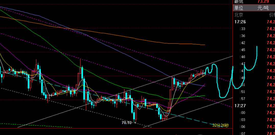 今日来看,从分割角度,82.7-70.1,可以知道74.9一线存在382分割压制点;同时结合小时线通道,也可以看出74上方正在不停的测试上轨压制点;macd多头也有所衰减,不过小时线10均线未有效失守前,仍处于一定逼空状态,需耐心等待信号,关注74.9及上方承压形态;支撑留意小时线中轨和66日支撑72.2,触及看企稳延续反弹修正即可,站上74.9,下一个分割压力是76.4,刚好也是小时线年均线,这应该需要一定震荡时间才能给到;总体上,短期看反弹修正为主,遇关键压力位看承压,直到几日后顶背离严重后再看拐点抛售;