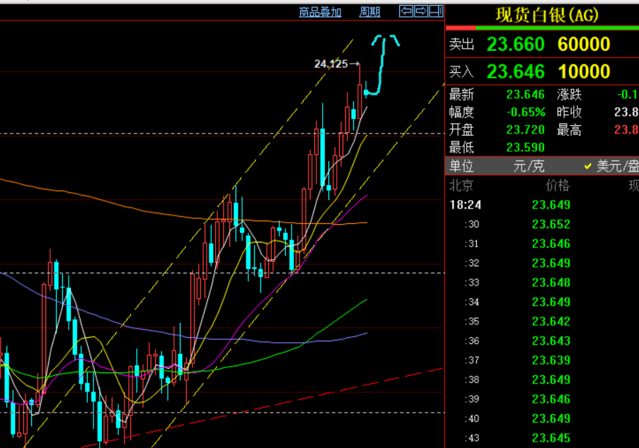 第二,白银方面:依托日线5均线上,顶底支撑23上方,也得到了不错的支撑买盘,一波拉升至最高24.2一线,离25短期目标也就不远了;