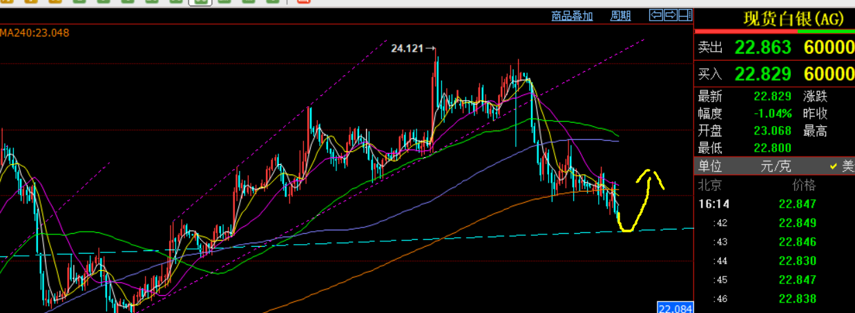 第二,白银方面:昨日坚守23一线,短线也是底部整理过程,反弹23.4一线;