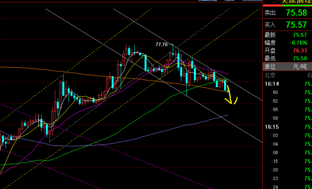 原油方面:昨日欧盘反弹,但双顶承压77.7不上,且它是日线通道上轨和中轨共振压制点,则判断77.7下有压制去逢高看下行,初步判断拐点承压,结束前三日的反弹修正;而要正式确认,就看今日是否继续收阴; 今日日线中轨下移77.2,短周期处于一定下滑通道内发展,短线压力76.2-76,依然维持短期转跌下行,支撑关注74.9一线,再往下是73.9; 只要日线无法站上中轨和通道上轨上方,则大概率要跌一波;