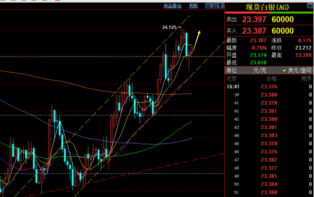第二,白银方面:同样,依托日线中轨和通道下轨支撑上,以及短周期趋势支撑,判断22.5-22.7存在买盘需求,提示触及看涨,当前23.3一线,符合预判;