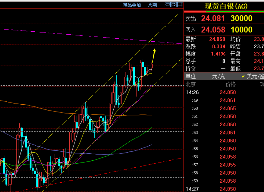 白银方面:日线级别白银的上涨走势是更加明显的,走的很强,每次震荡回踩两三天后,直接一天大阳都干回去,继续保持多头趋势,短期内耐心等25一线目标,今日风水岭23.76,此位置作为一定防守支撑,逢低延续看涨即可,回踩关注23.9一线位置支撑;