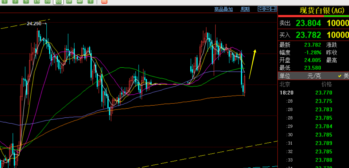 第二,白银方面:支撑23.8拉升再次承压前高24.3下,进行高位区间整理;