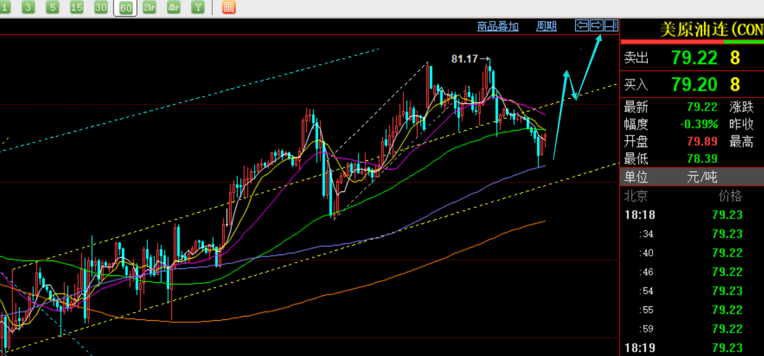 原油方面:日线维持震荡上行通道,依然是回测多为主,由于今日早盘有所失守图中通道支撑,则耐心等靠近78一线逢低去看企稳,此位置也是日线通道下轨,不过价格也未触及,最低78.4一线,既然理想好的入场点踏空,那么从当下小时线看有一定企稳,关注10均线,一旦突破站上它,则会进一步的上行试探80一线通道反压,也只有重新站上80,则可以继续走强冲击81上方;
