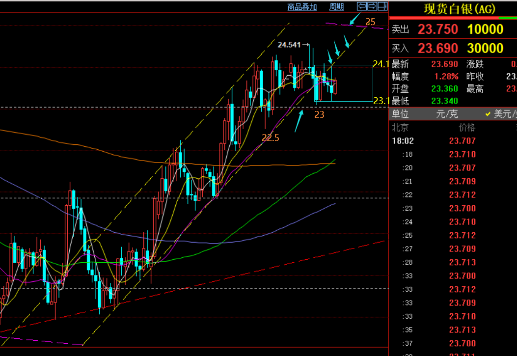 白银方面:它的震荡范围比较清晰,日线上升通道的确破位了,本周就处于下轨之下压制整理,24.1-23.1是这几天的运行区间,看消息来刺激引导;只要下轨一直承压,无法有效回归通道之内,短期还是看压制调整为主,当然,短趋势和长趋势也是多头的,能调整一波,今年一季度后金银都是要布局牛市的; 若有效破位 23,则打开下调空间;反之,一直坚守,则可能还会反复的拉高回测,强压25下;