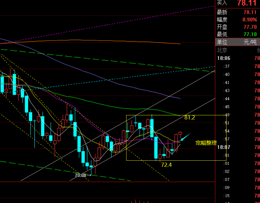 原油方面:日线昨日大阳拉升,且收盘价站上中轨,则短期弱势底部整理结束,步入区间宽幅对待,短期震荡延续看上行,中轨回踩支撑76.7,今日欧盘低点77,虽没触及,但既然拉升破隔夜高点,意味着支撑是有的;晚间则以77作为风水岭,关注顶底位置77.6-77.8看企稳,上方阻力79.5和80.6,强压81.4下前高,这里只要不突破,日线短趋势还处于空头范围,一旦突破了,趋势反转,当前短期震荡看涨为主;