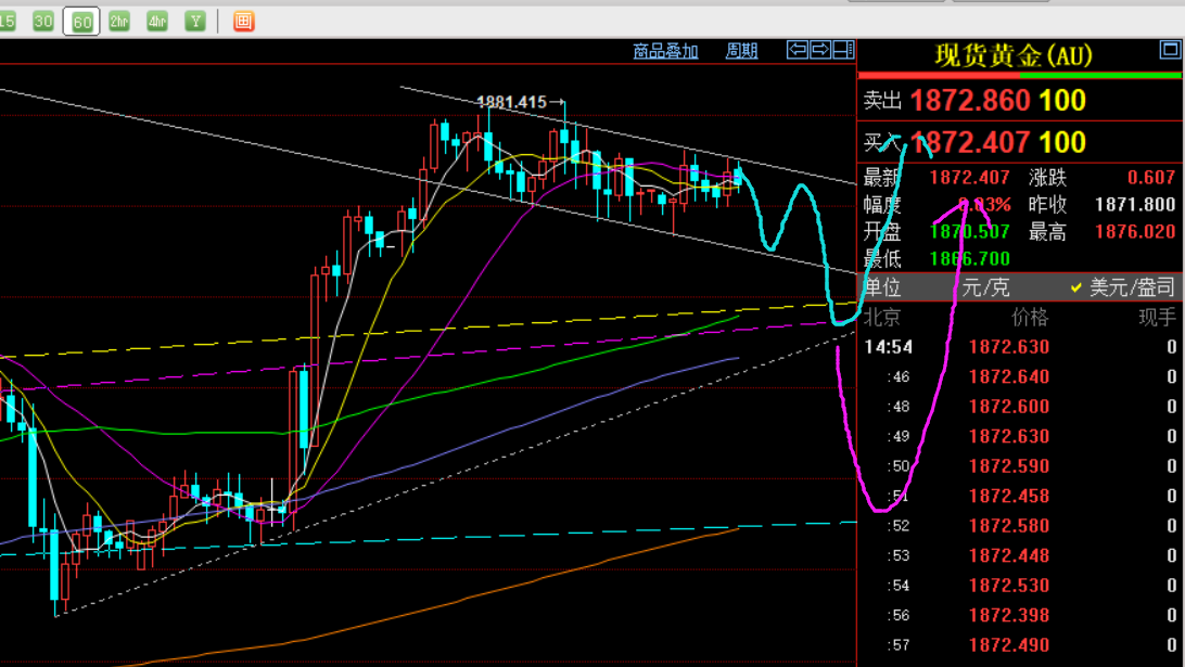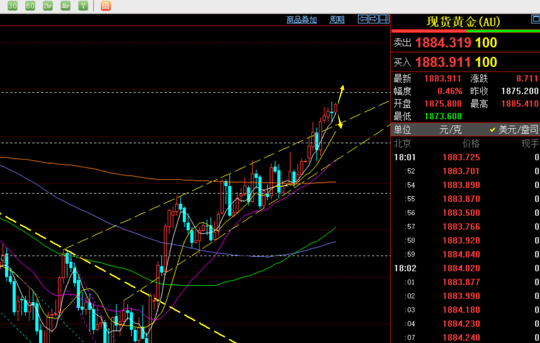 郑氏点银:黄金接近风险强压区,启动中长期布局 回顾昨日行情走势及出现的技术点: 第一,黄金方面:昨晚ci年率符合市场预期6.5%,不过小于前值7.1%,通胀进一步慢下移;由于并未走低太多,并未小于预期,价格则先跳空先急跌一波至1875,刚好触及日线5均线支撑,但速度秒快,没时间反应,很快回升