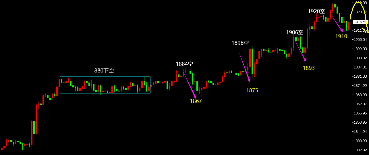 郑氏点银:黄金再次逼空走高,1914上继续高位整理 回顾昨日行情走势及出现的技术点: 第一,黄金方面:昨日早盘先承压1909跌至1900,马上从1900突破1909,小时线底部形成大阳包阴结构,就意味着突破后会有延续上行动能,因此布局1907跟多,同时1910激进加仓了多,因为早间一波拉升后,午后横盘不