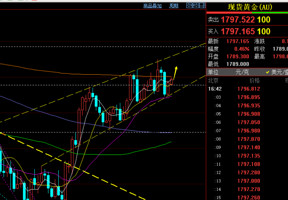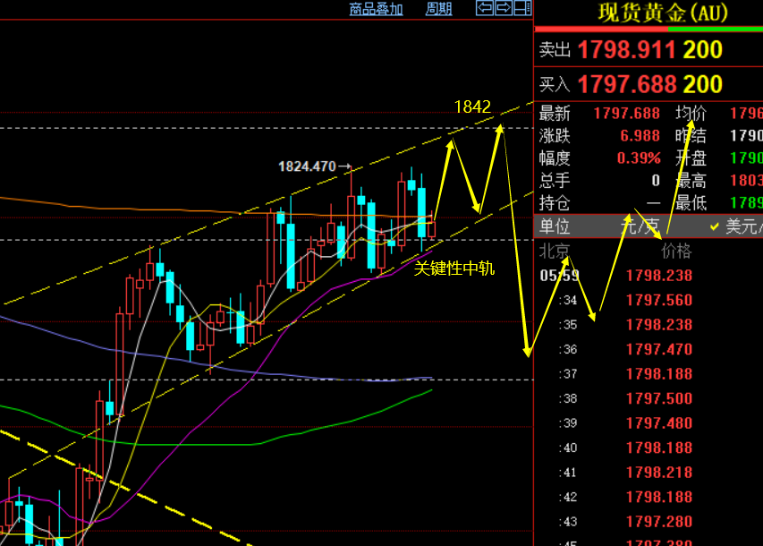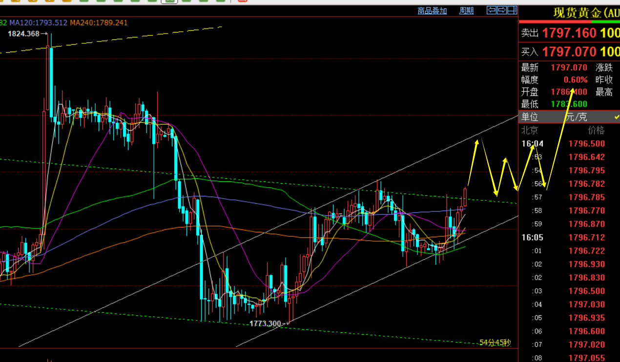 郑氏点银:黄金继续循环震荡,日线1797逢低看上行 回顾昨日行情走势及出现的技术点: 第一,黄金方面:昨日白盘直接延续隔夜震荡压制,并未先回补长上影,美盘跌至1797一线低点后企稳,而此位置是处于日线关键通道下轨位置,近一个月只要处于通道支撑上运行,靠近都容易震荡反攻拉升一波,乃至刷