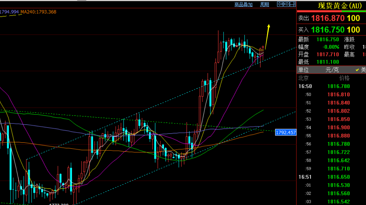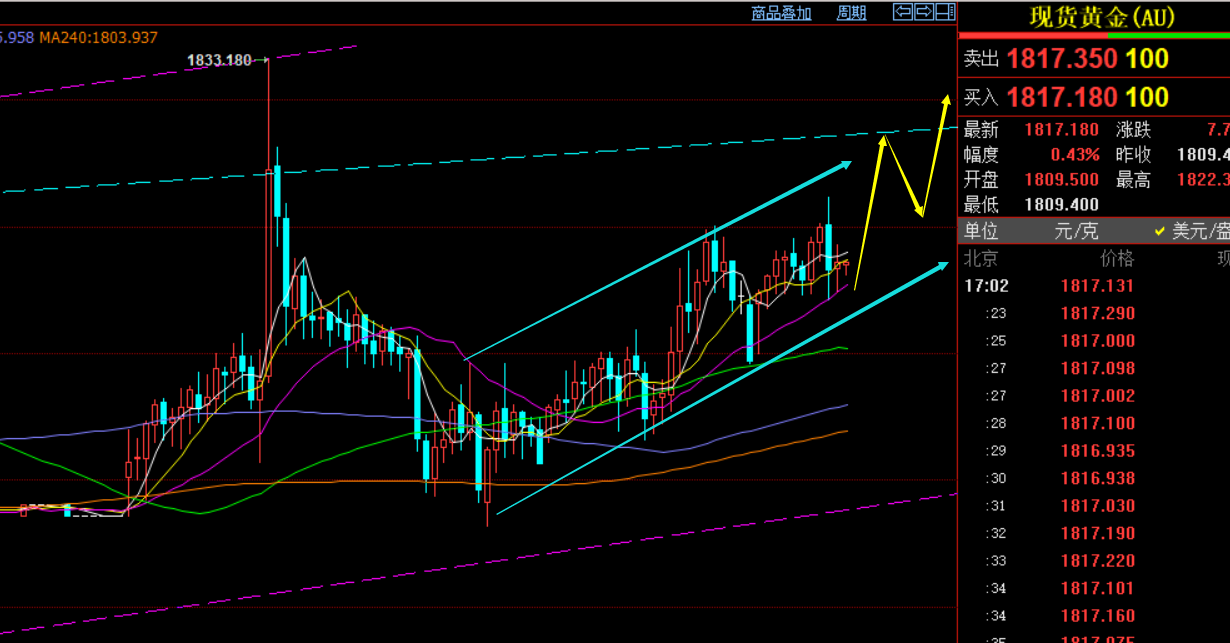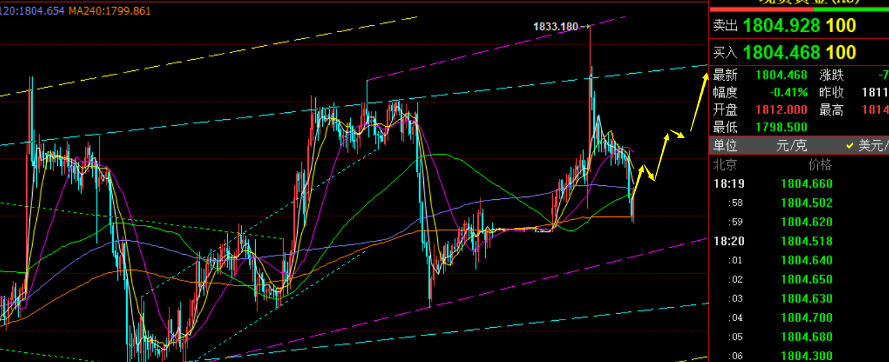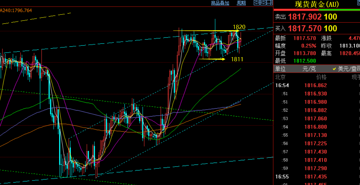 郑氏点银:黄金震荡背离拉升循环仍在延续,1811成风水岭 回顾昨日行情走势及出现的技术点: 第一,黄金方面:昨日早盘多次下探短期通道下轨,始终无法有效下穿,那么隔夜低点支撑下会带来震荡氏反弹,午后一波急拉就基本说明低位买盘存在,欧盘的再次回踩就是继续跟多的时机,美盘顺利上破,抵达1
