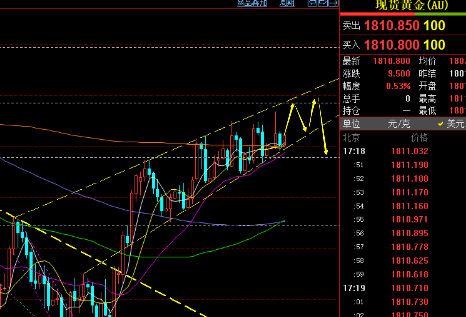 郑氏点银:黄金警惕日线循环魔咒继续演绎,油短期上攻 回顾上周五行情走势及出现的技术点: 第一,黄金方面:首先,上周四隔夜支撑1796探底拉升至1810一线承压回落,上周五早盘小幅回测支撑1802再次反弹至1810,就又上破的动能;亚盘反弹,整个欧盘始终未失守早间低点,美盘则继续看震荡上行,当