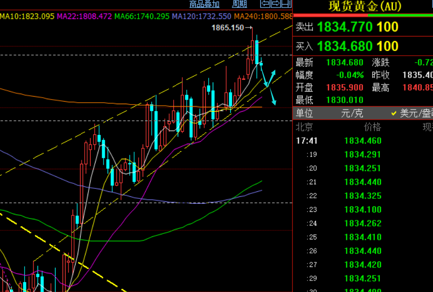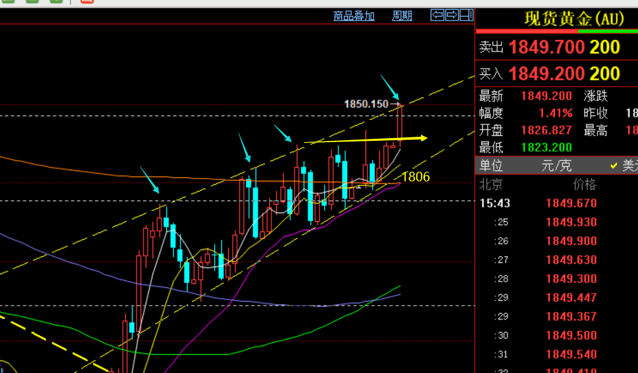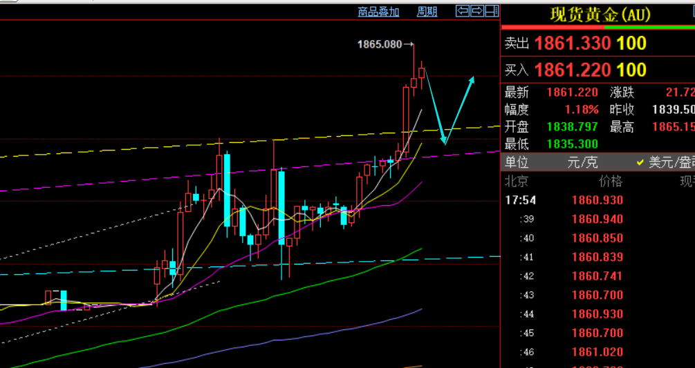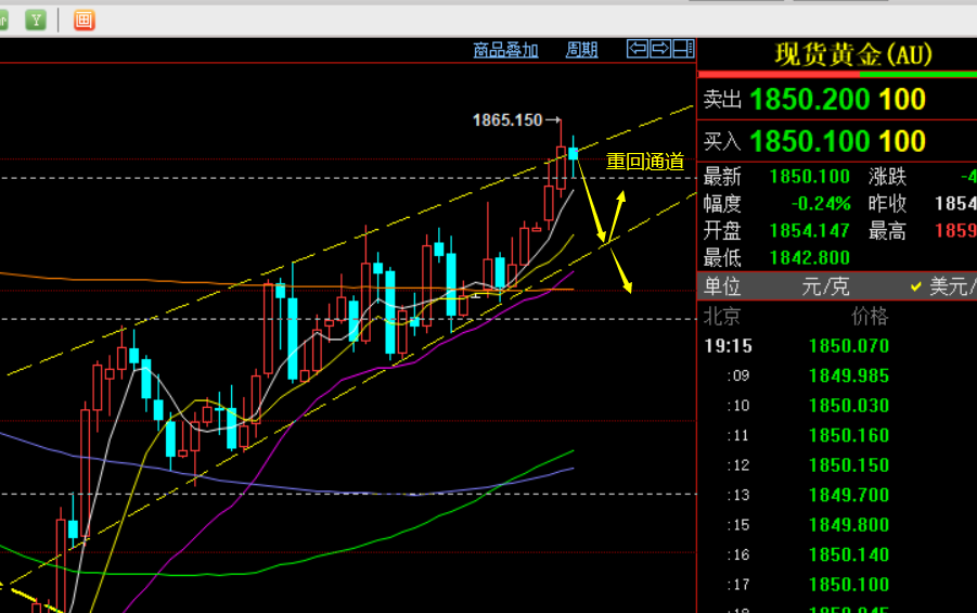 郑氏点银:黄金重回日线通道,短期或承压上轨 回顾昨日行情走势及出现的技术点: 第一,黄金方面:周二隔夜两次承压1850下跌至1830一线,力度还算偏大,因此周三早盘以1850作为双顶承压防守,反弹继续测试阻力压制,但价格直接慢涨上破1850强拉一波;当小时线承压1865顶部出现射击之星受压形态,