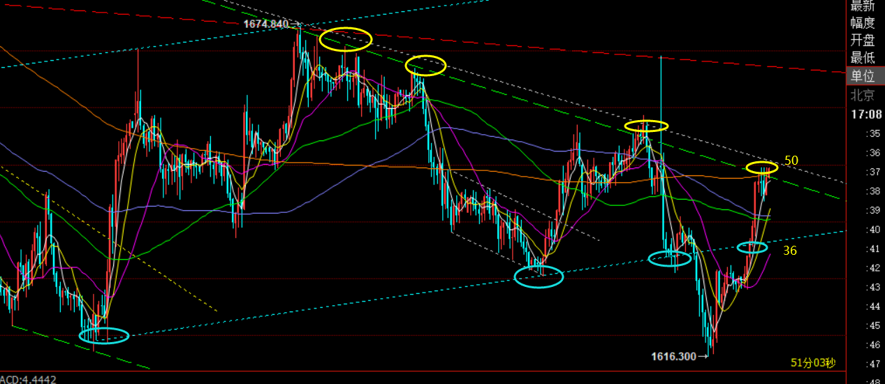 回顾上周五行情走势及出现的技术点: 第一,黄金方面:上周五的行情上演一场极度反转,和上周三后半夜的走势形成一个超级大V,当昨日还是大幅下跌后,第二天一般选择反弹空为主,即便是震荡,也有关键压力位会承压,比如618分割位置,比如通道阻力,但上周五就是一根筋的一路逼空拉升,阻力都失效,日内两次布