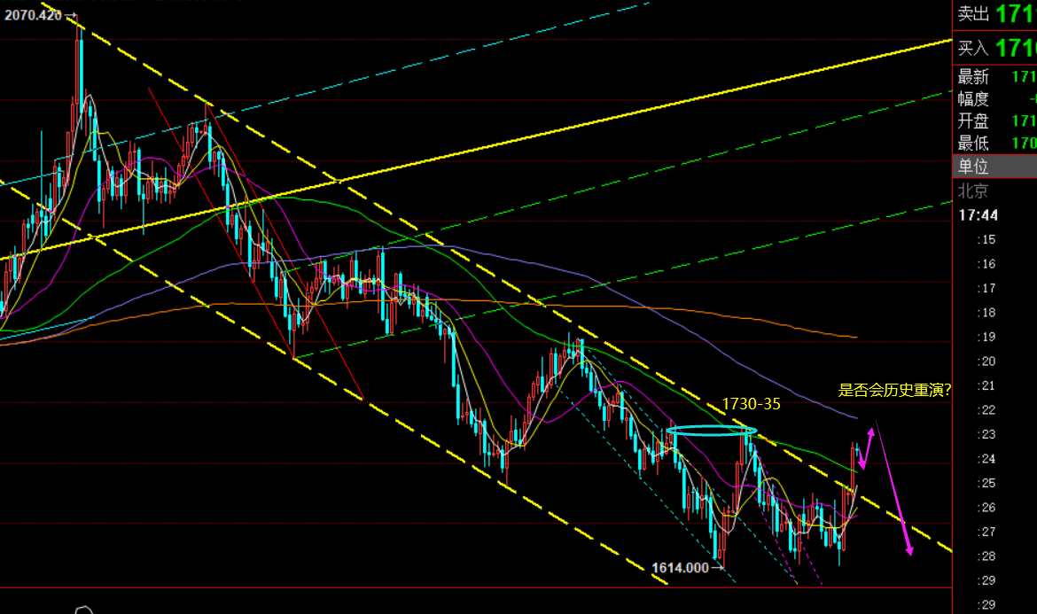 回顾昨日行情走势及出现的技术点: 第一,黄金方面:由于周三夜间跌破1616底部以来的逼空上涨通道下轨支撑,则昨日周四看下跌调整延续,依托短期下行通道来推演布局,每触及上轨一线就是短空的入场时机,整体以震荡缓慢氏下行为主,所以给到的上轨做空点机会很多,盘中1770、1766、1765、1762、1763高点逐步下