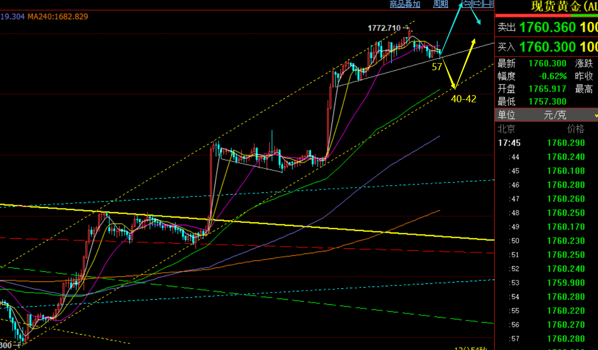 回顾昨日行情走势及出现的技术点: 第一,黄金方面:昨日整体还是依托日线5均线再次高位整理,“搓揉”组合形态虽不明显,但具备一定变盘信号,4小时acd波峰值强调已是一定极限,它才是关键点,昨晚短期上行通道下轨支撑已失守且反抽确认过破位有效,最终今日早盘迎来一波下探跌至1760一线,手中空单则扩大利润
