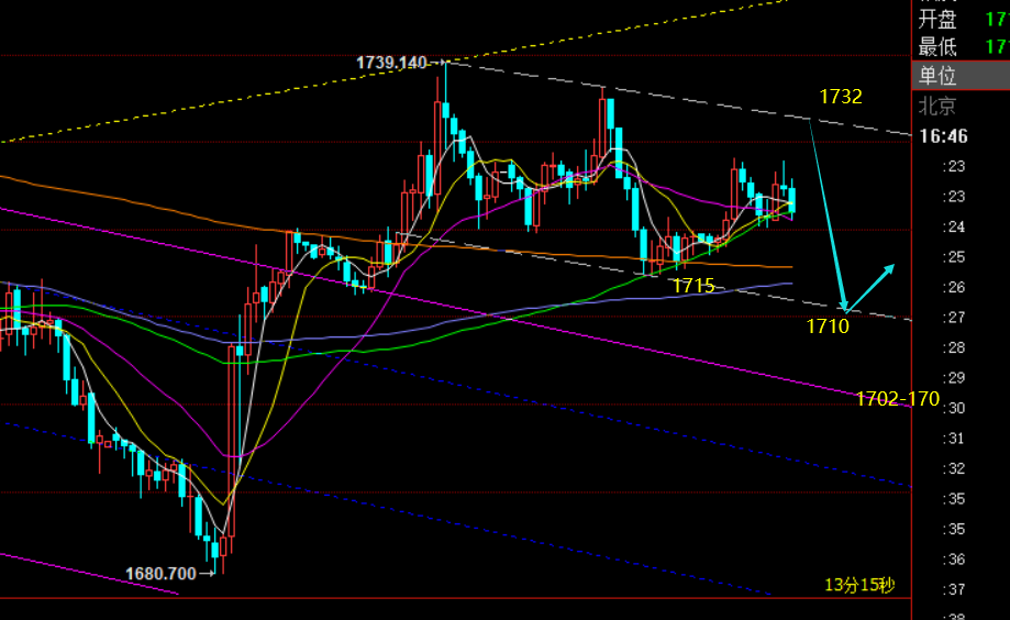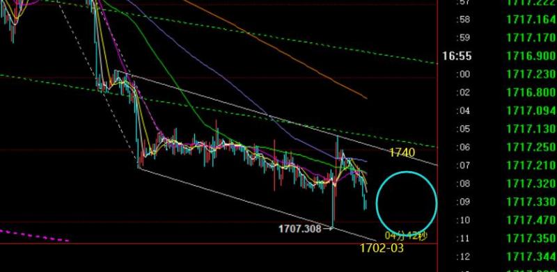 郑氏点银:黄金如期破底下跌走弱,原油依旧看拐点见顶 回顾昨日行情走势及出现的技术点: 第一,黄金方面:昨日早盘横盘压制于凌晨1712一线高点,则提示1712直接先空,随后连跌破位短期趋势支撑点1708-09,则提示加仓空,目的就是看欧盘走弱打压下行,美盘再二次看跌走弱;然后欧盘走势进行了区间性反