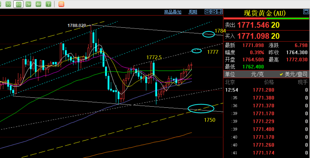 郑氏点银:黄金继续围绕50-80震荡,原油波段空拿下仍跌 回顾昨日行情走势及出现的技术点: 第一,黄金方面:周二隔夜持续破位走低,昨日早盘直接先反弹,那么这种走势下午后或欧盘承压得跟空一次,入场点选择参考小时线中轨和50分割共振点1770-71一线去空,欧盘跌至1760一线(处于早盘拉
