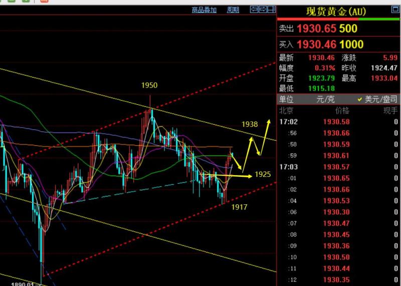 郑氏点银:黄金1938延续看上行,原油底部弱势整理 回顾上周五行情走势及出现的技术点: 第一,黄金方面,隔夜探底拉升,凌晨支撑于1929上,第二日早盘先回测,则午后或欧盘前后要择机跟多一次,参考点首选凌晨横盘位置,以隔晚起涨点1922作为防守,继续看震荡上行;而整个欧盘波幅狭小,