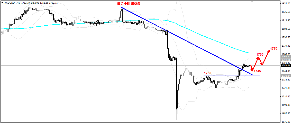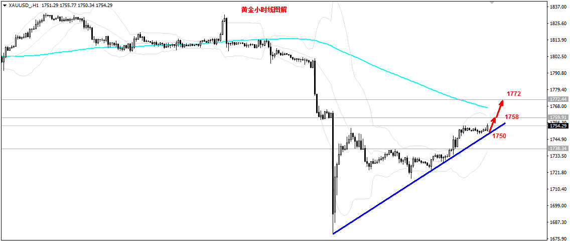 黄金如期突破1755,现报1756,突破黄金分割点50.0关键阻力压制,继续看涨。笔者早盘1750多单获利中,继续上看。 笔者反复强调过,暴涨暴跌之后,尾盘横盘整理,是中继信号。早盘在1748上整理蓄势,多头再度起飞。小时线K线依托中轨之上阶梯式上行,多头通道完整。金价创出新高,多头有了延续性。所以,空仓者回撤继续干