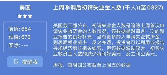香港时间周四20:30,美国将公布3月27日当周初请失业金人数数据。上周初请失业金人数降至一年低位,本周有望进一步下滑。