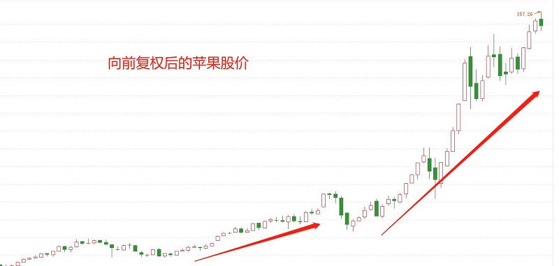 这里只展示苹果公司的股票,因为其它四支个股的走势与其大同小异。当然,图中的股价是经过向前复权后的走势,如果不进行复权的话,会由于两次拆股(1拆7和1拆4)而不易进行分析。