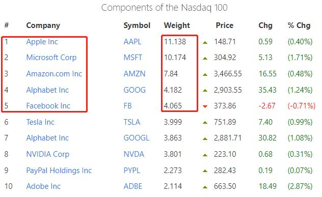 这五家公司正好是我们前面提到的FAAMG,奈非的权重排在11位,占比1.757%,虽然没有这五家企业占比高,但从排名来看,依旧靠前。