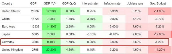 德国失业率仅为3.6%,处于充分就业状态;通胀率3.9%,偏高,但欧央行行长已经将其定性为“低基数效应下的暂时现象”。可以看出,德国的失业率比美国低,通胀率没有美国高,所以其经济潜能要高于现阶段的美国。