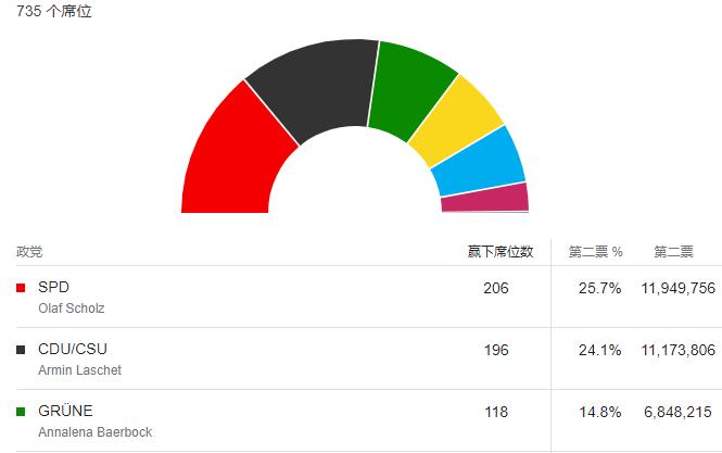 SPD获得206席位,占比25.7%,高出第二名的CDU/CSU 总计10个席位,1.6个百分点。SPD由德国汉堡市市长肖尔茨领导,其在公开讲话中提到:在默克尔(属于CDU/CSU)执政16年后,现在是“德国该有崭新开始”的时刻,“我们需要改变,要一个由SPD领导的政府”。