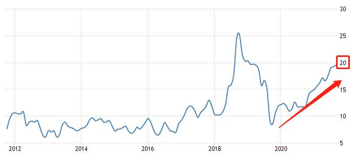 2019年10月份,土耳其的CPI还只有8.55%,一年时间过去,CPI已经猛增至将近20% 。要知道,主要经济体将2%的CPI设定为合理水平,超过3%就有物价失控的风险,超过5%就认定为恶性通胀。现如今土耳其的CPI已经达到19.58%,可以说局面接近失控。