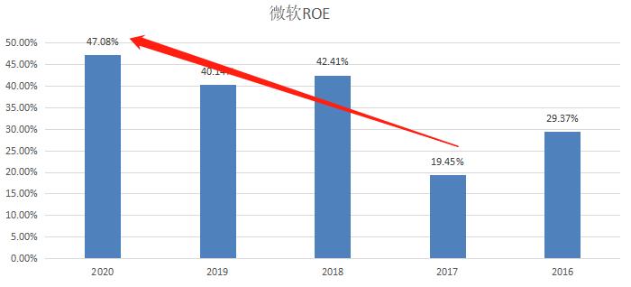 微软市值位居纳斯达克指数第二位,其股价涨跌也会对纳斯达克100指数构成显著影响。从上图可以看出,微软的ROE走势没有苹果公司那么均匀向上,但整体也保持着增长的态势。从绝对值角度考虑,微软2020年ROE为47.08%,利润空间非常丰厚,其股价即便回调,幅度也不会太大。