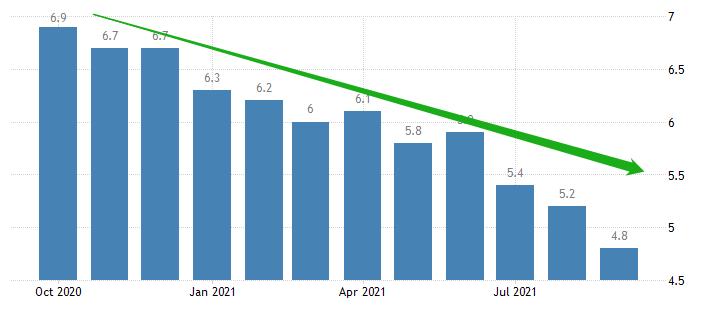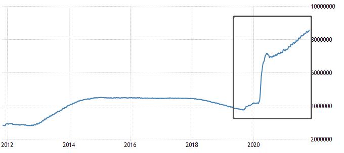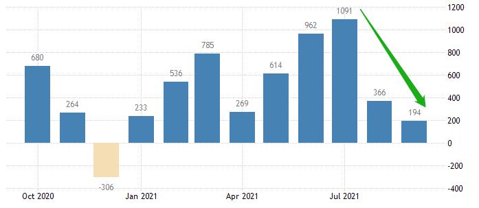 美联储最新的资产负债表总额为8.56万亿美元,这一数字在2020年之前还只有4万亿左右。从上图可以看出,美联储资产负债表在2020年7月份上涨趋势有所减缓,呈现出小波浪型的增长,但增速绝对值依旧偏高。在美联储执行缩减每月购债之后,上图曲线的倾角将大幅减小,到每月购债清零之后,曲线将拐头向下。逻辑上将,美联储资产负债表的降低,能够推动美元指数走强。所以,预计周四凌晨2:30左右,EURUSD、黄金等品种将出现一波短线下跌。